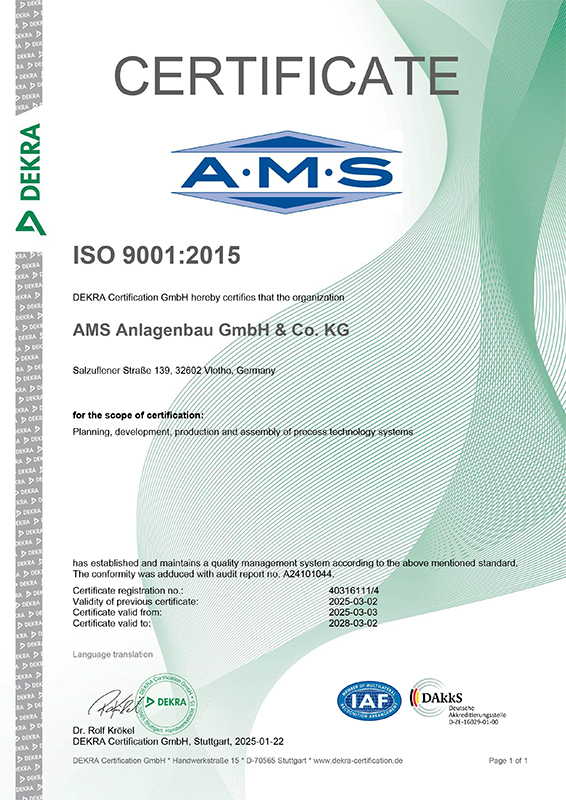 We are pleased to announce that the quality management of AMS Anlagenbau GmbH & Co.KG has been certified according to the new quality standard ISO 9001: 2015. It assures our customers and partners also in the future a high level of quality.